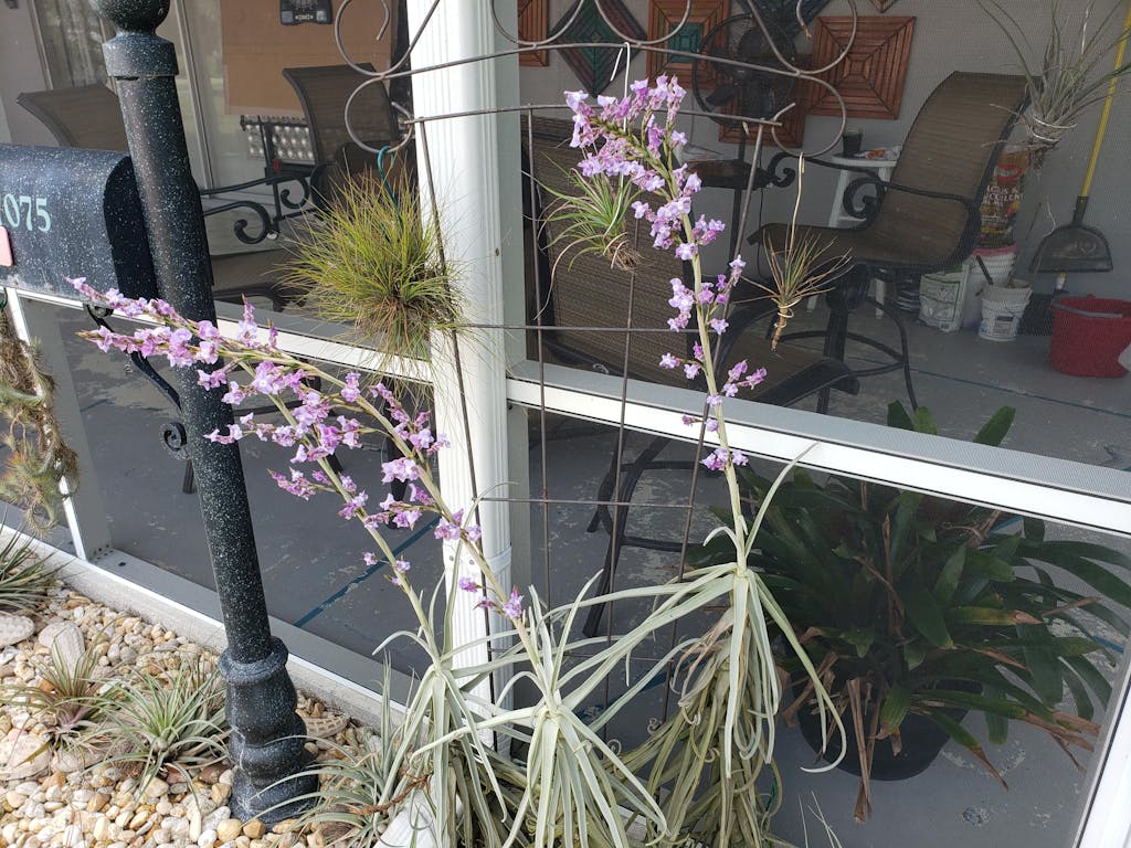 The inflorescence is simple or may be branched but bears many very large purple flowers. The fragrance is very strong and a single specimen can perfume an entire garden. Does not root as an adult, so it must be attached with glue or wires to a mount. Best results may come from suspending the plant from a string or wire and hanging it in a bright airy spot. Easiest of all the fragrant Tillandsias to cultivate.