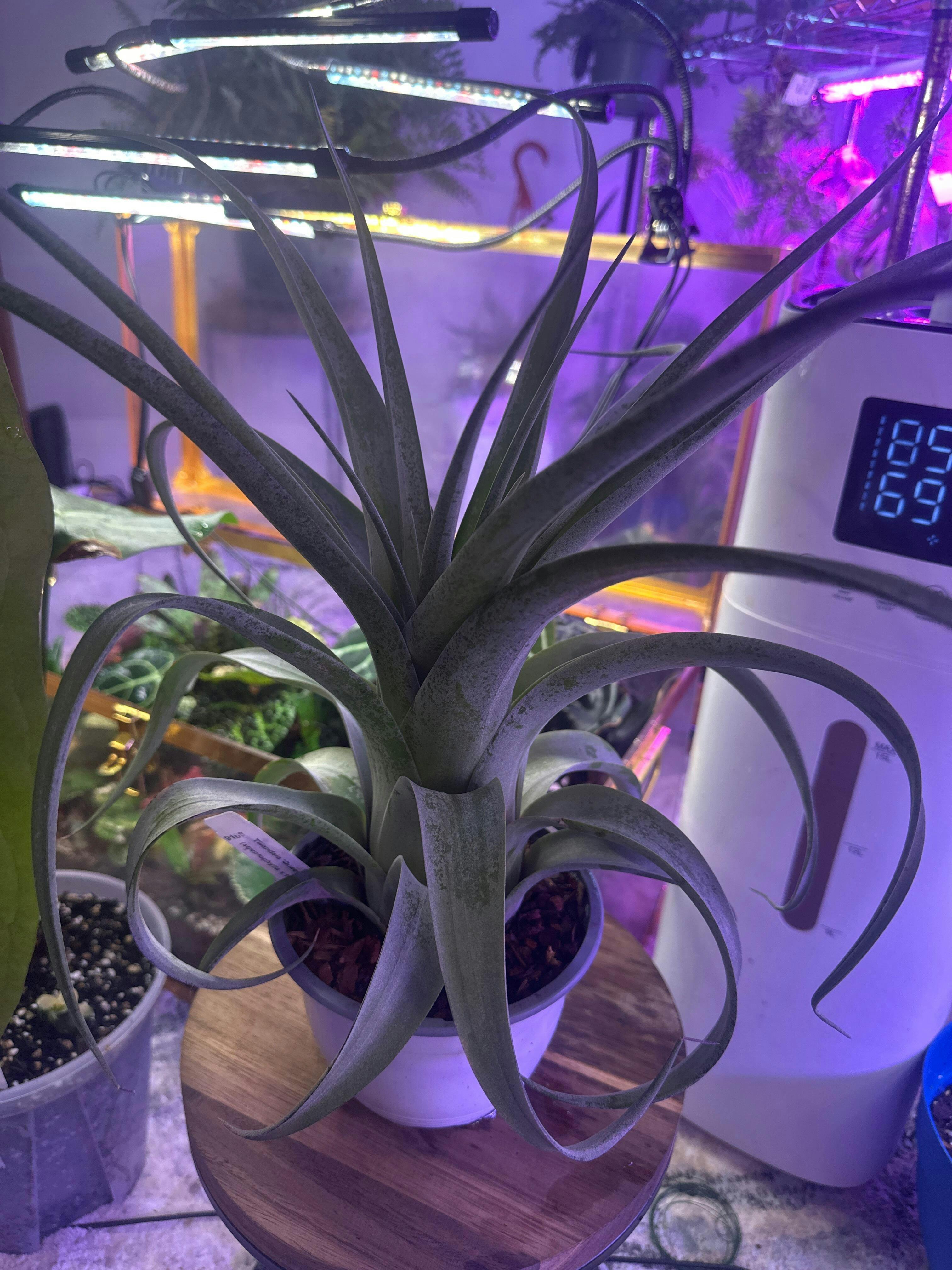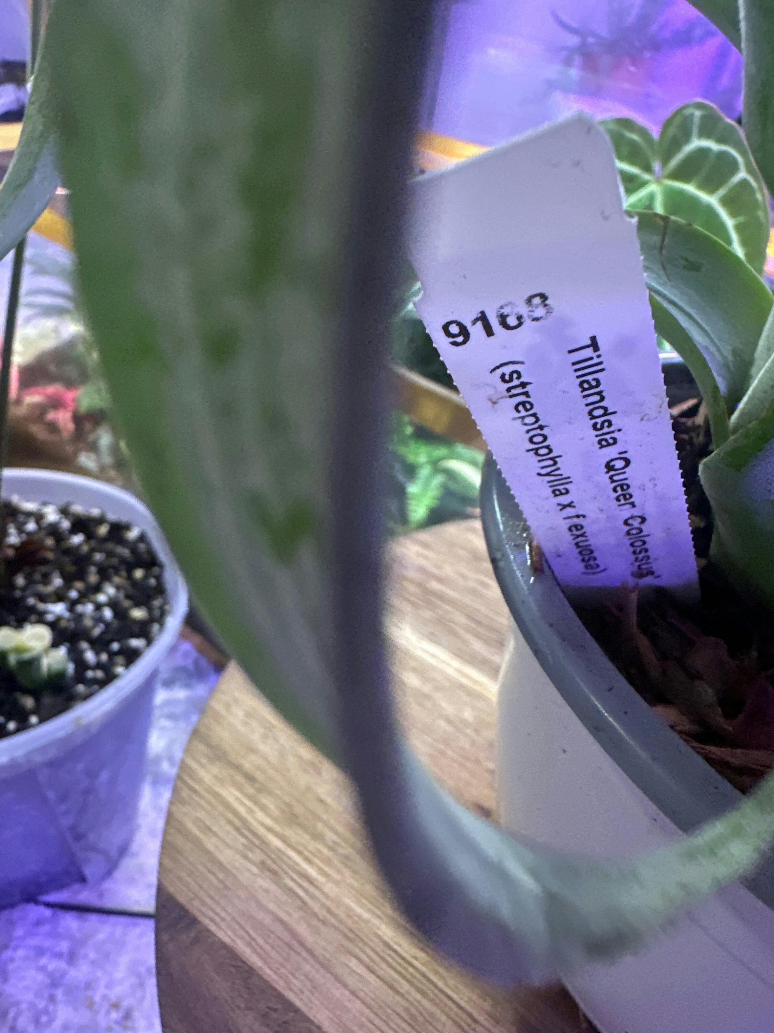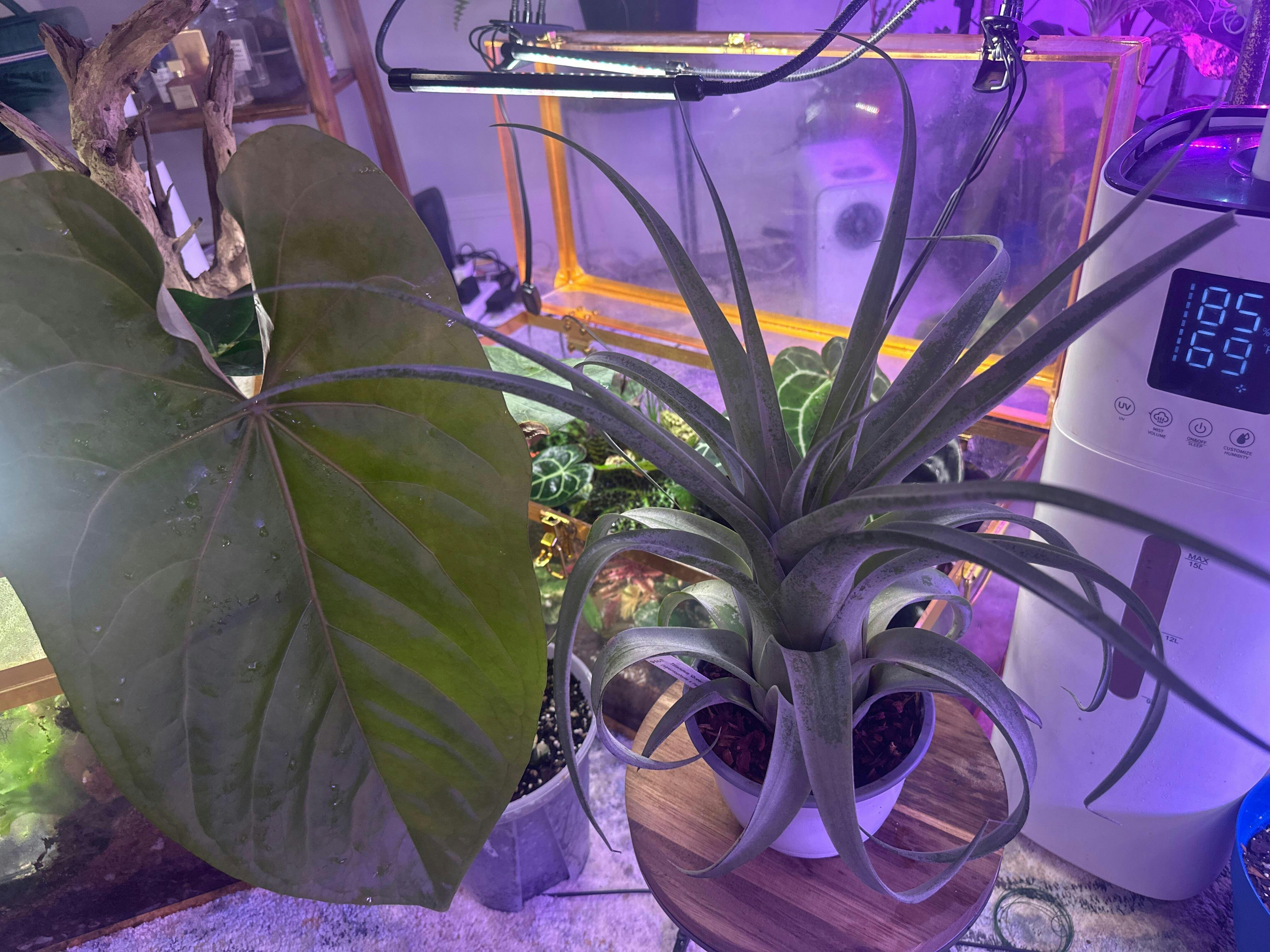 A large growing hybrid from Ray Coleman. Super wide leaves that twist down at the tips. Dark green with a deep purple veneer with variegation. The variegation is almost unnoticeable due to the veneer. Anthesis color is a deeper purple,